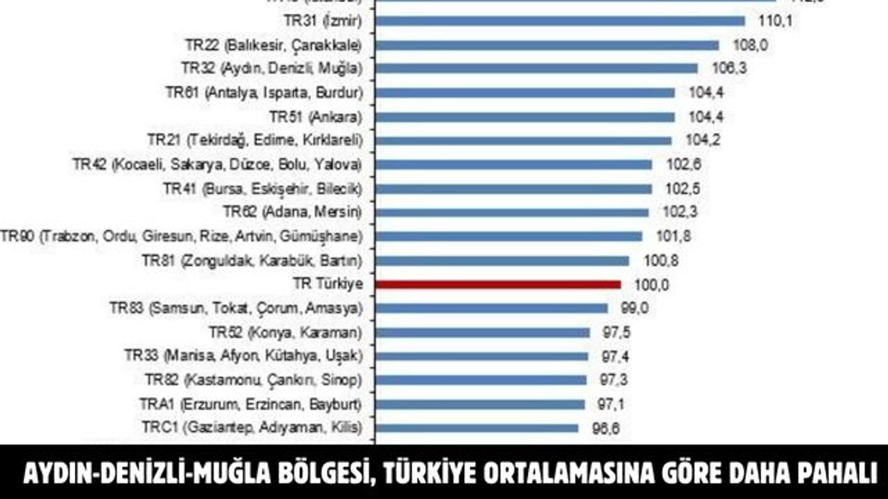 İstatistiki Bölge Birimleri Sınıflaması (İBBS) 2. Düzey esas alınarak hazırlanan çalışmada, ortak bir mal ve hizmet sepeti üzerinden bölgesel fiyat düzeyleri hesaplandı. Endeks değerinin 100’ün üzerinde olması, ilgili bölgenin Türkiye ortalamasına kıyasla daha pahalı olduğunu gösteriyor.